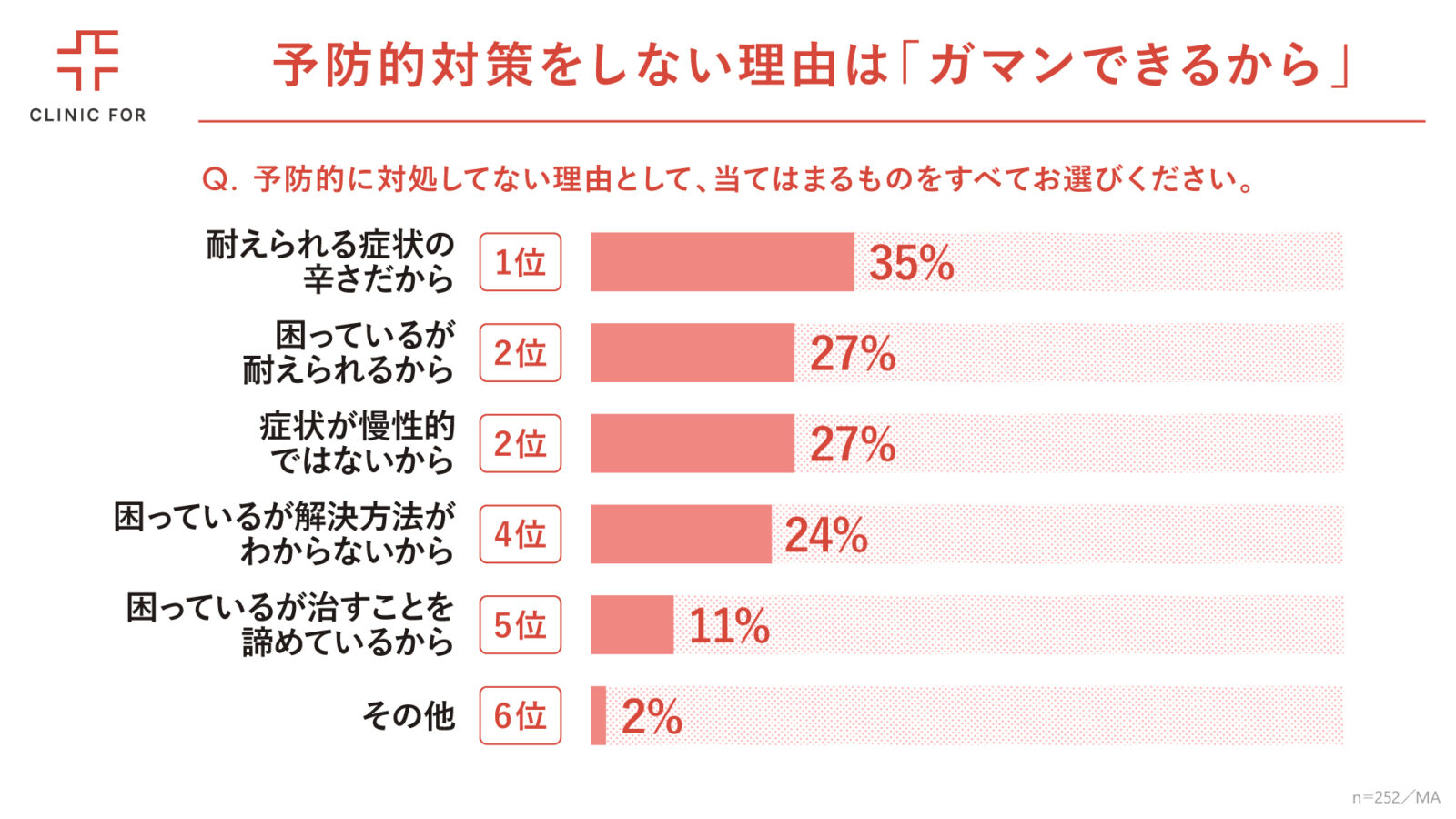 と、不調をガマンしている傾向にあることがわかりました。一方で、「困っているが解決方法がわからないから」も4人に1人(24%)存在し、適切な対処方法が浸透していない現状が示唆されます。