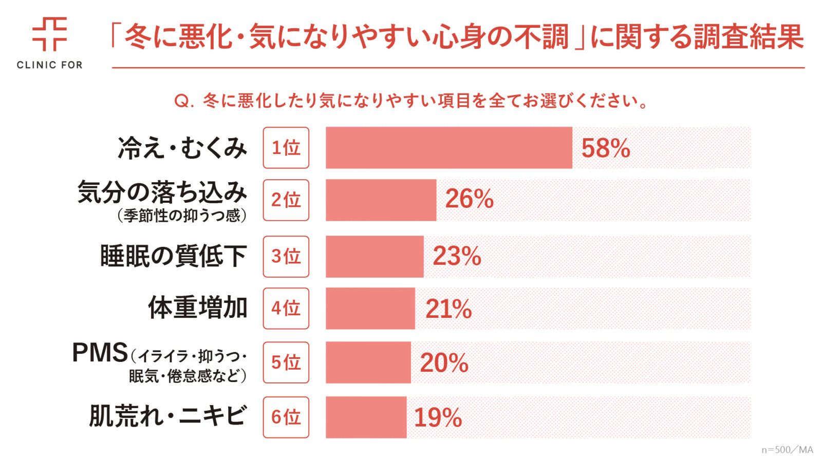 一都三県在住の20~40代女性500名に、冬に悪化したり気になりやすい心身不調を調査したところ、