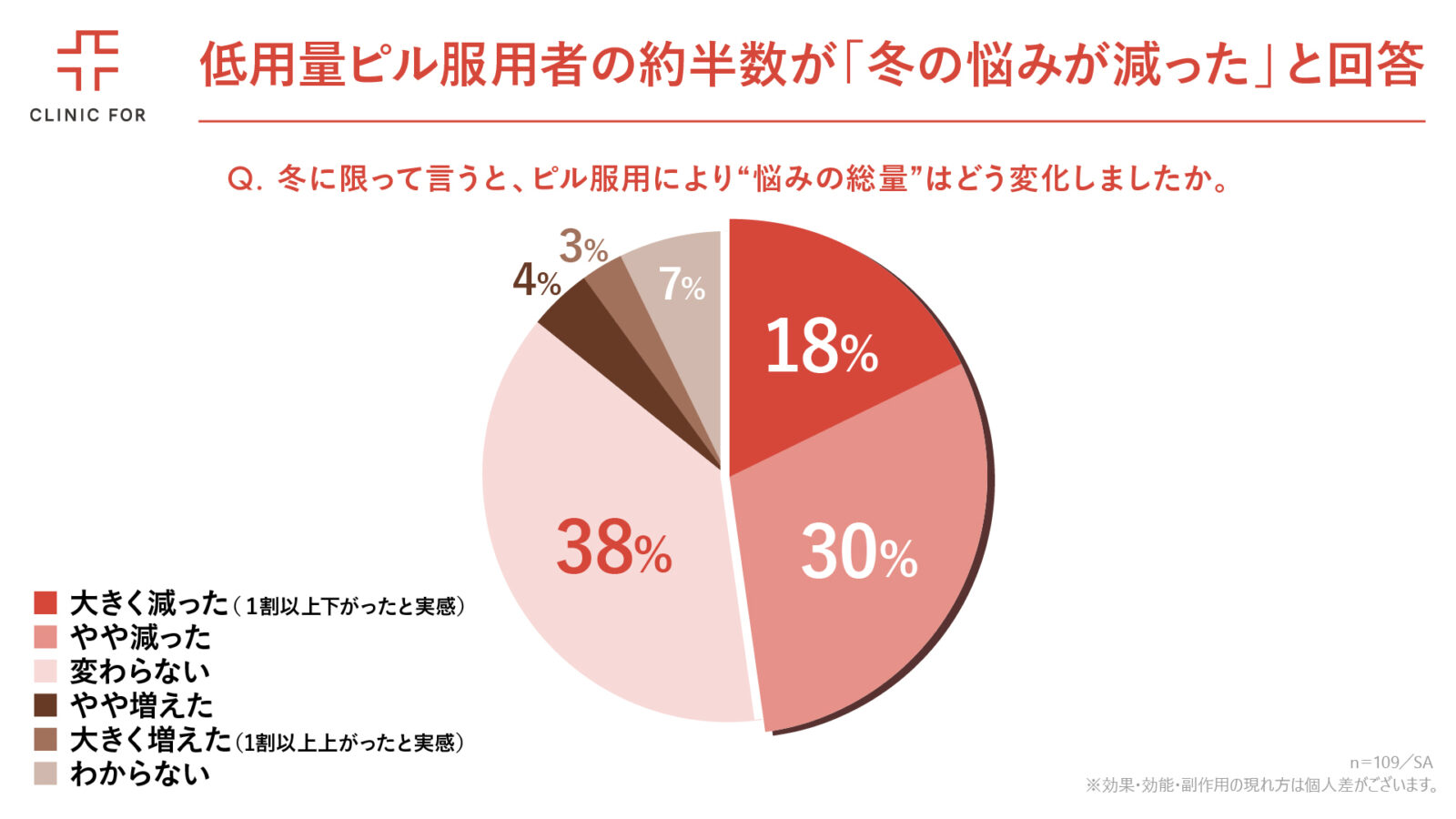 ホルモンバランスの乱れに起因する冬の“なんとなく不調”への予防的対策の1つとして、「低用量ピル」があります。低用量ピルを「現在服用している」109人に、冬に限ったときに低用量ピル服用により「悩みの総量」がどう変化したか調査しました。