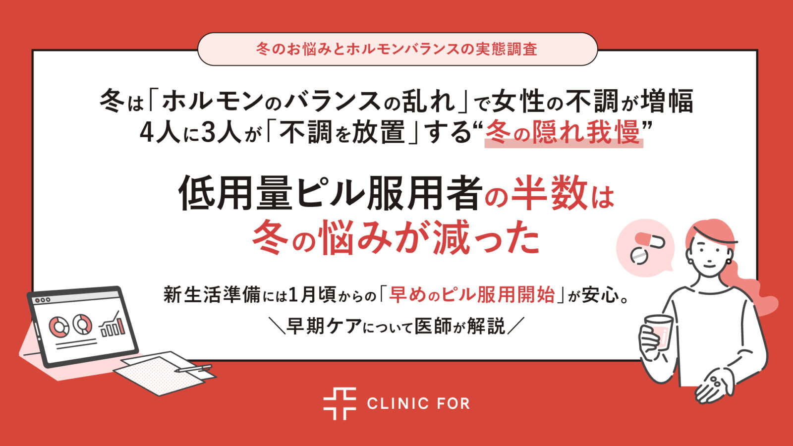 対面診療とオンライン診療を展開する「クリニックフォアグループ」(以下クリニックフォア)は、女性が感じる冬の心身の変化とホルモンバランスとの関係性を明らかにし、その対策方法について啓発すべく「冬のお悩みとホルモンバランスの実態調査」を実施しました。