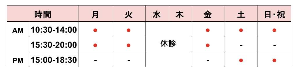 ◇診療時間:月火金:10:30〜14:00 / 15:30〜20:00