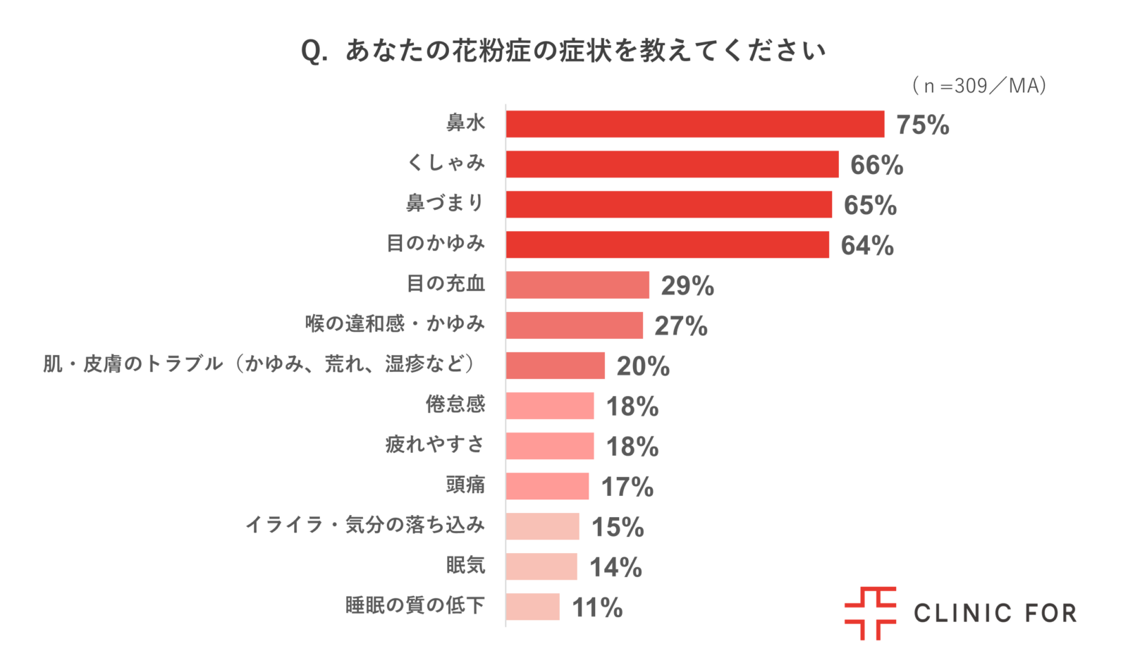 働く花粉症の人309名に、どのような症状が出るか質問したところ、最多が「鼻水(75%)」、次いで「くしゃみ(66%)」「鼻づまり(65%)」「目のかゆみ(64%)」となりました。この結果から、花粉症の主な症状は呼吸や視界に影響を及ぼしやすいものが中心であり、これらが集中力の低下や日常業務への支障につながる可能性が示唆されました。