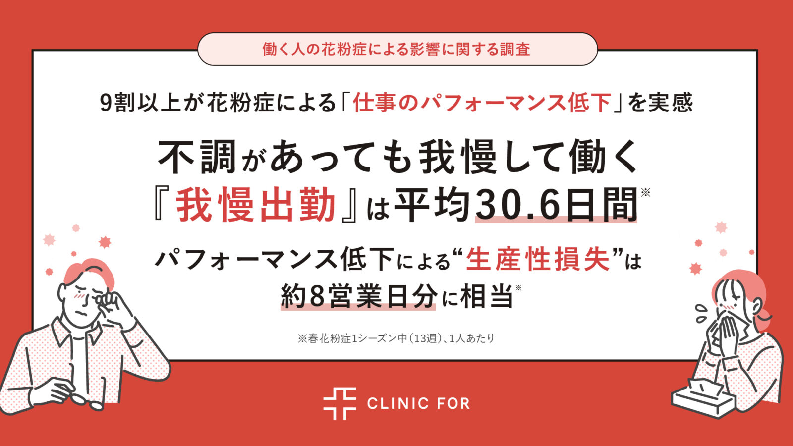 【働く人の花粉症による影響に関する調査】9割以上が花粉症による「仕事のパフォーマンス低下」を実感 不調があっても我慢して働く『我慢出勤』は平均30.6日間※