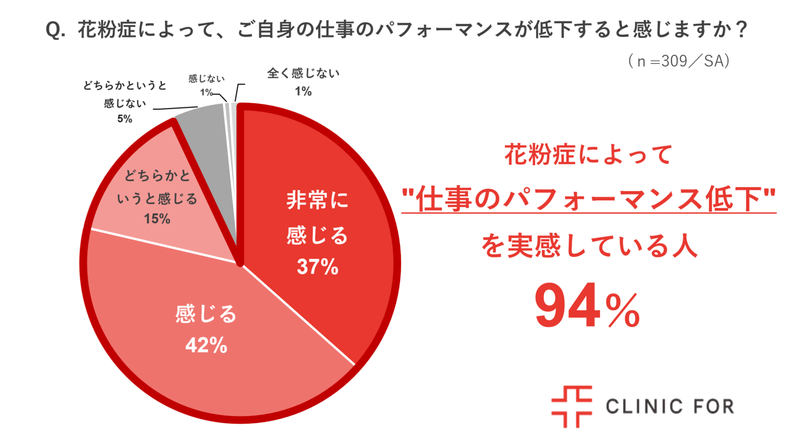 働く花粉症の人309名を対象に、花粉症による仕事のパフォーマンスへの影響について調査したところ、94%が「仕事のパフォーマンス低下を感じている」と回答しました。ほとんどの働く花粉症の人が、仕事への影響を自覚していることがわかりました。