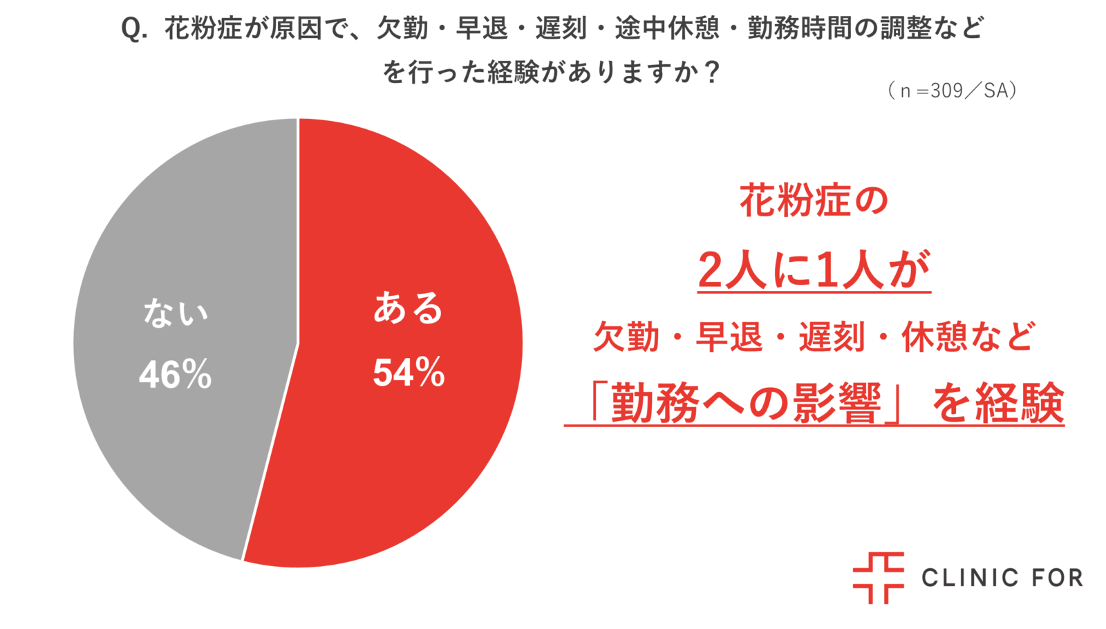 働く花粉症の人309名を対象に、花粉症が原因で、欠勤・早退・遅刻・途中休憩・勤務時間の調整などを行った経験があるかを調査したところ、54%が「勤務への影響を経験」していることが分かりました。
