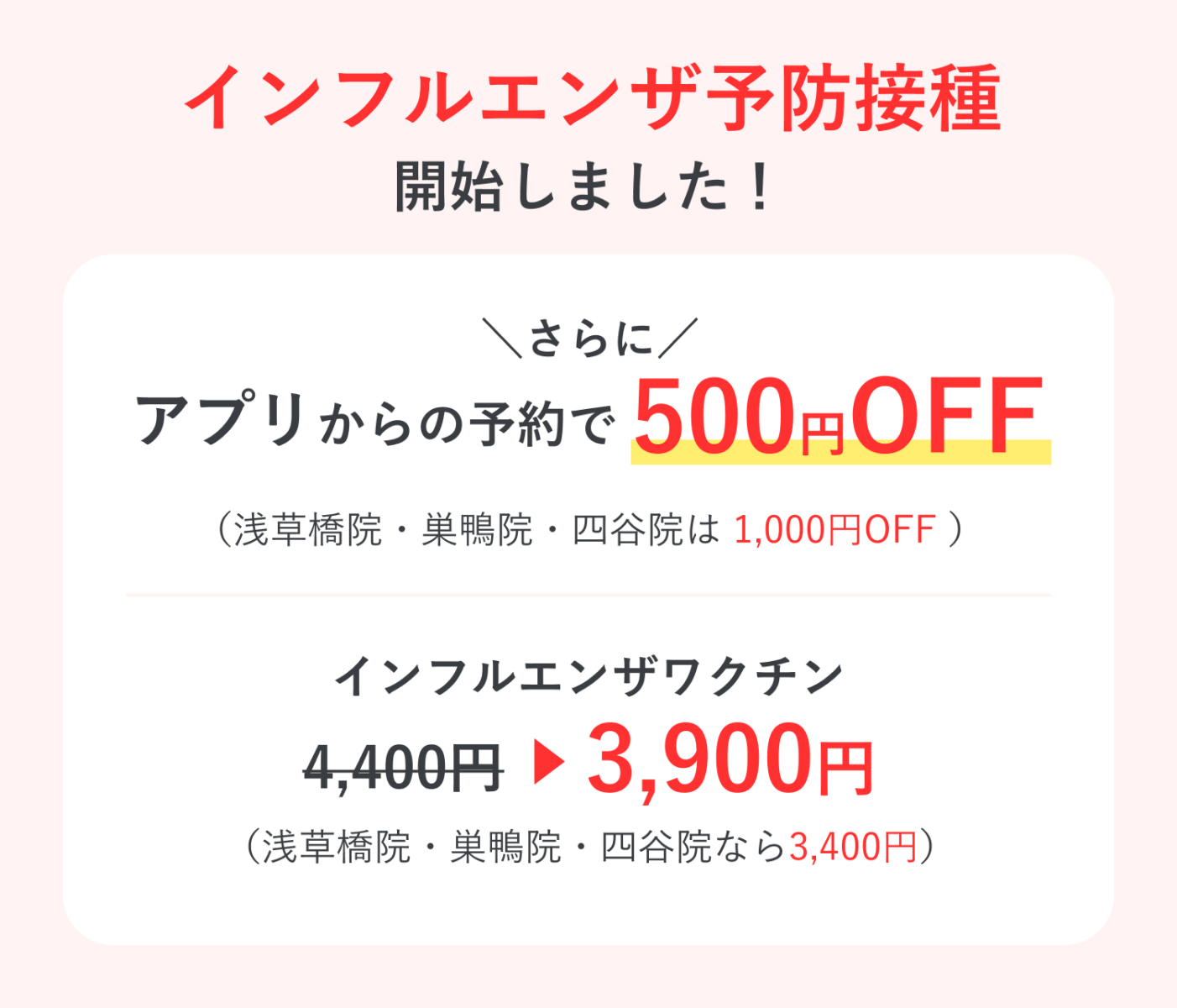 割引対象: 「クリフォア」アプリから各院の「インフル予防接種」を選択のうえ来院予約をした方