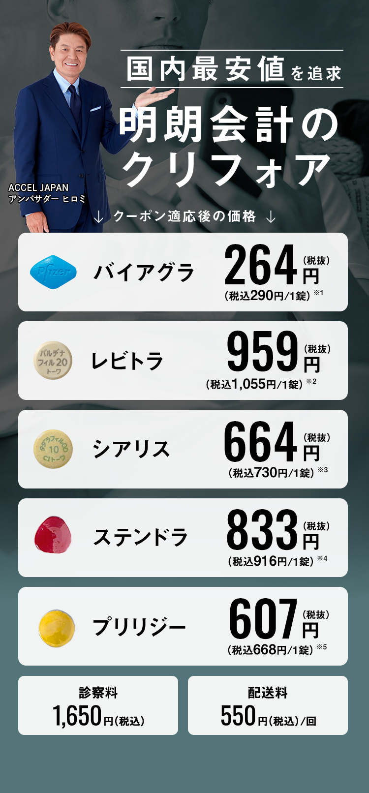 ※ 別途配送料550円、処方がなく診察のみの場合は診察料1,650円がかかります(税込)