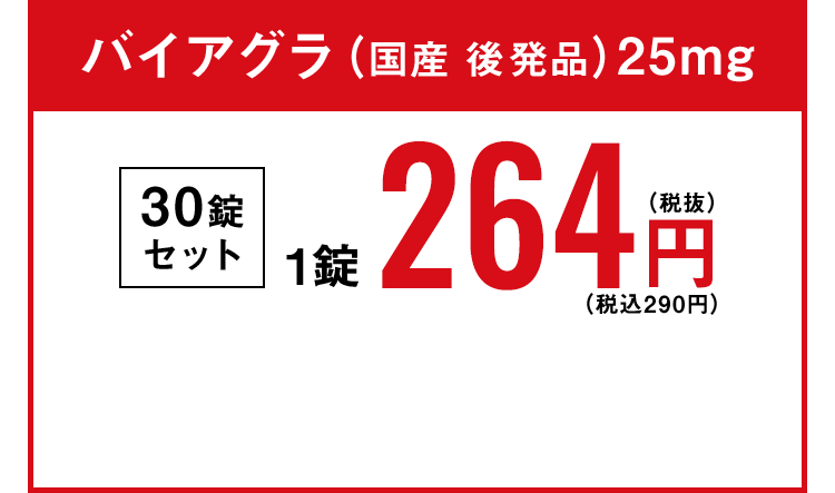 ※1 バイアグラ25mg(国産 後発品:シルデナフィル)30錠セットの1錠分のお薬代 ※2 レビトラ10mg(国産 後発品バルデナフィル)30錠セットの1錠分のお薬代 ※3 シアリス10mg(国産 後発品タダラフィル)30錠セットの1錠分のお薬代 ※4 ステンドラ100mg(海外 後発品アバナフィル)30錠セットの1錠分のお薬代 ※5 プリリジー30mg(海外 後発品ダボキセチン)30錠セットの1錠分のお薬代