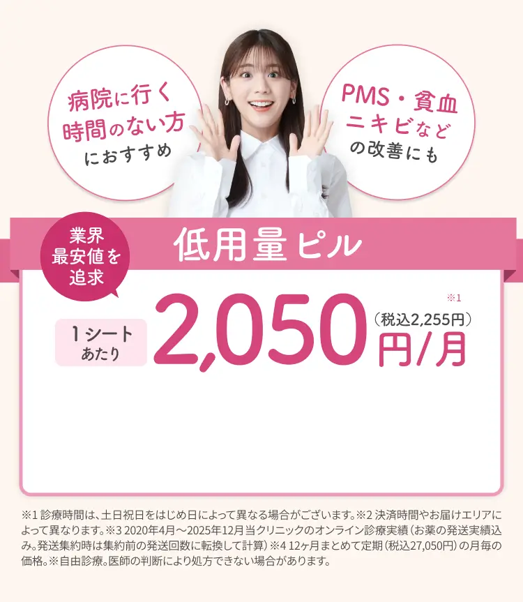 低用量ピルを試したいと思っていましたが、処方して貰うために毎日通院するのは面倒だなぁと思っていました。電話診療でお薬を郵送してもらえるので、働く女性には大変助かります。