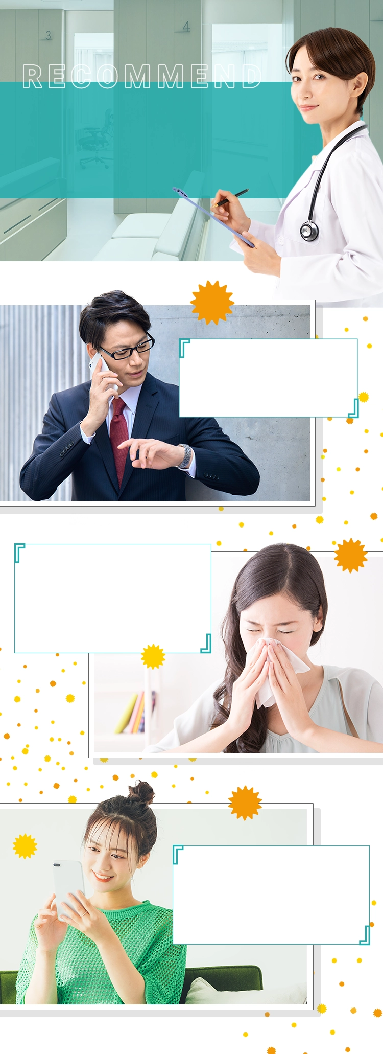 対面外来と比べて、診察料に大きな差はなく同水準です。交通費などがかからず、花粉が多い時期でも、家やオフィスなどで診療をうけられるため、負担は少ないです。