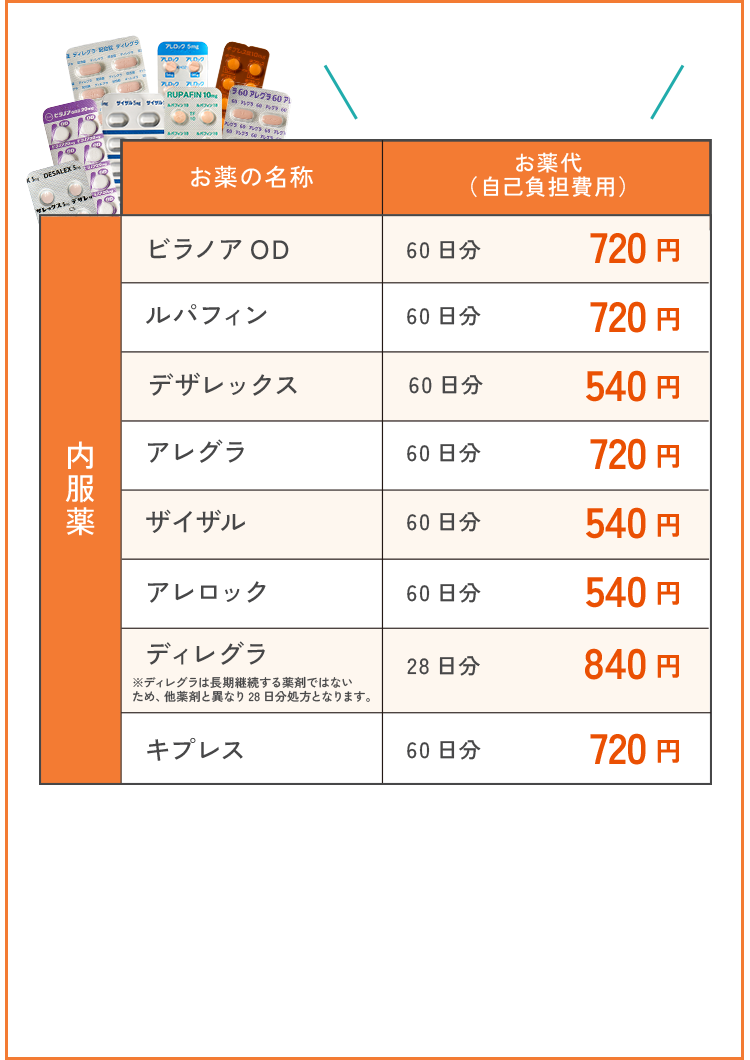 ※タリオンやクラリチンなど、オンライン花粉症で扱っていないお薬と同じ薬剤をご希望の場合は、オンライン保険(アレルギー科)で対応可能です。院外処方のため、薬局からのお薬お渡しとなります。