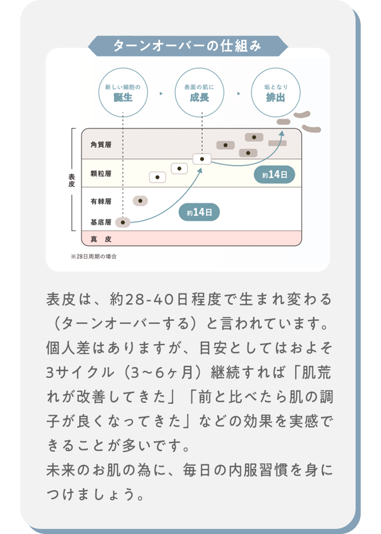 お肌が生まれ変わるには一般的に約28~56日かかると言われています。