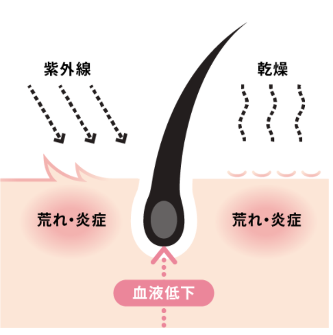 頭皮の荒れ・炎症については、皮脂が異常に多く分泌されることで毛穴が詰まったり頭皮に炎症が及び、その結果として髪の成長が止まってしまうと考えられています。また、乾燥、菌、紫外線(UV)などによっても頭皮に悪影響が出ます。