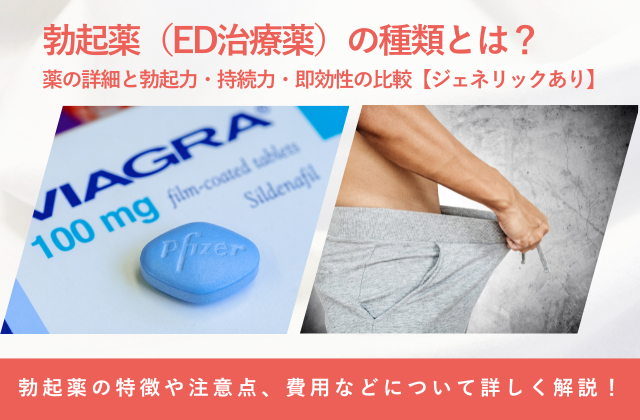 勃起薬(ED治療薬)の種類とは?薬の詳細と勃起力・持続力・即効性の比較【ジェネリックあり】